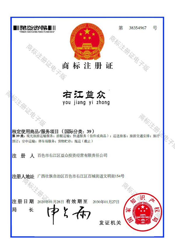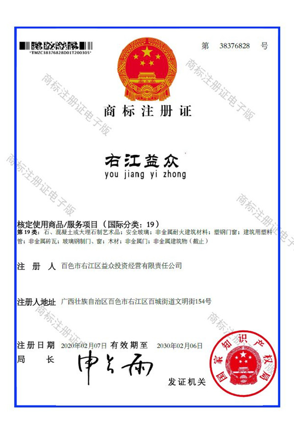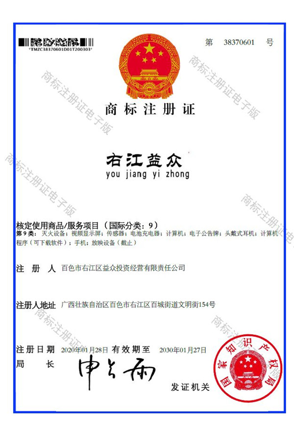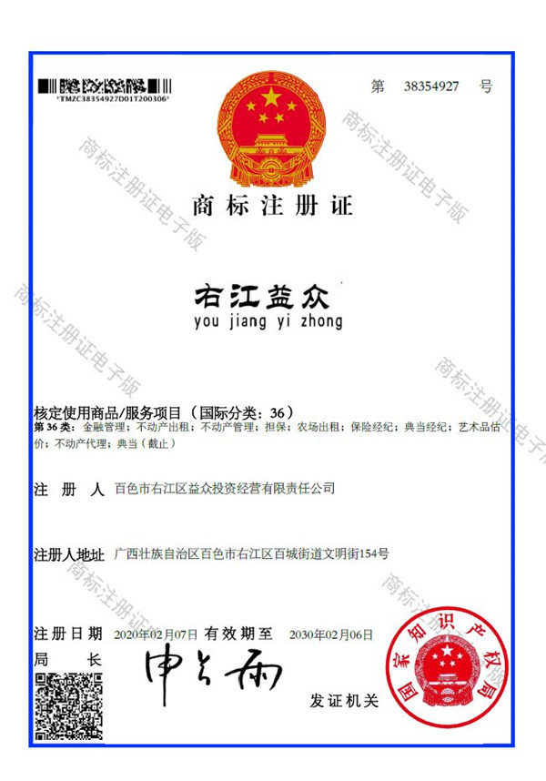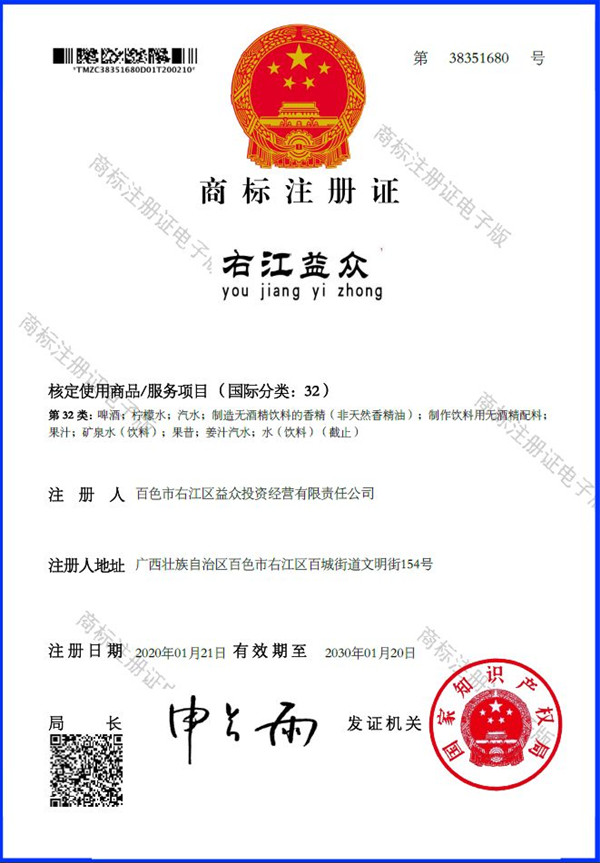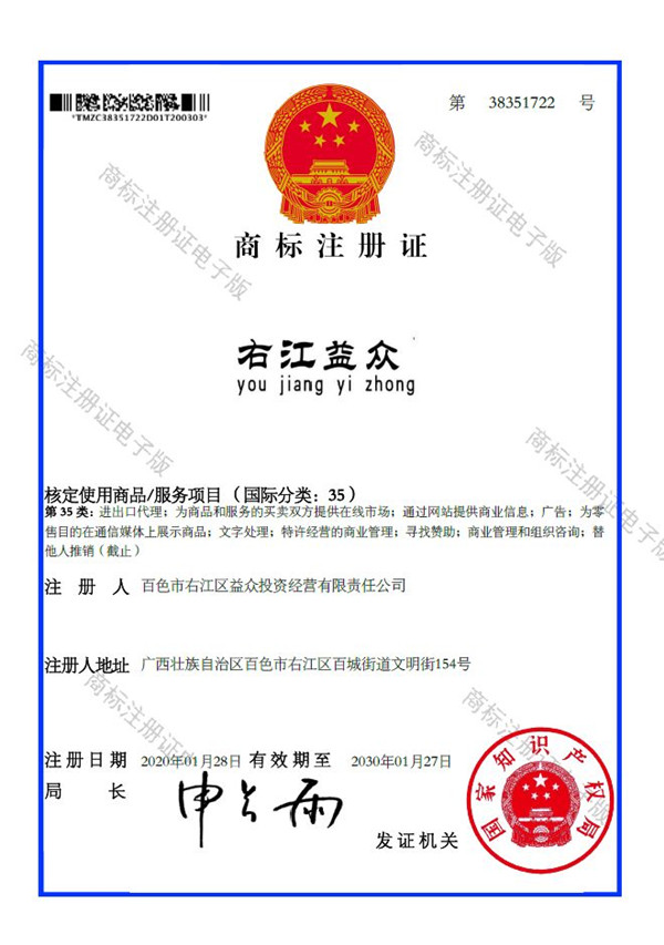 2019年4月,為樹立企業(yè)品牌形象,充分展現(xiàn)品牌價(jià)值,廣西百色益眾投資有限公司按照建設(shè)現(xiàn)代企業(yè)的方向和標(biāo)準(zhǔn),啟動品牌商標(biāo)注冊申報(bào)工作,經(jīng)過6個(gè)月的審核期和3個(gè)月的公告期,“右江益眾”45個(gè)大類商標(biāo)品牌第一時(shí)間成功獲批?!坝医姹姟逼放频某晒ψ?,有利于公司更好地參與市場競爭,同時(shí),對于強(qiáng)化企業(yè)內(nèi)部管理、樹立良好的企業(yè)形象、提升公司美譽(yù)度也可起到積極的助推作用。