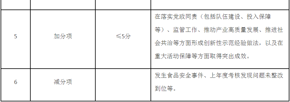 第五條 考核內(nèi)容主要包括食品安全基礎(chǔ)工作推進、年度重點工作落實、食品安全狀況等,同時設(shè)置即時性工作評價和加減分項(考核內(nèi)容要點見附件)。具體考核指標(biāo)及分值在年度食品安全工作考核方案及其細則中明確,設(shè)置要科學(xué)合理,可操作、可評價、可區(qū)分,切實減輕基層負擔(dān)。