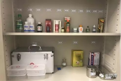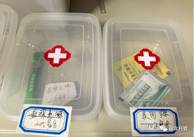 校區(qū)醫(yī)療角還專門設(shè)立了放置生病學(xué)生從家里帶來學(xué)校服用的藥品,每位學(xué)生按標(biāo)簽標(biāo)好,密封放置藥盒中,確保藥品不混淆、不受潮,按家長要求照顧孩子按時按量服藥。